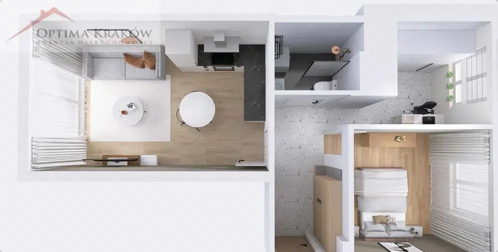 Mieszkanie składa się z pokoju dziennego z jasnym aneksem kuchennym do umeblowania i wyposażenia, sypialni i gabinetu/garderoby, łazienki z kabiną prysznicową z wc oraz przedpokoju i balkonu.